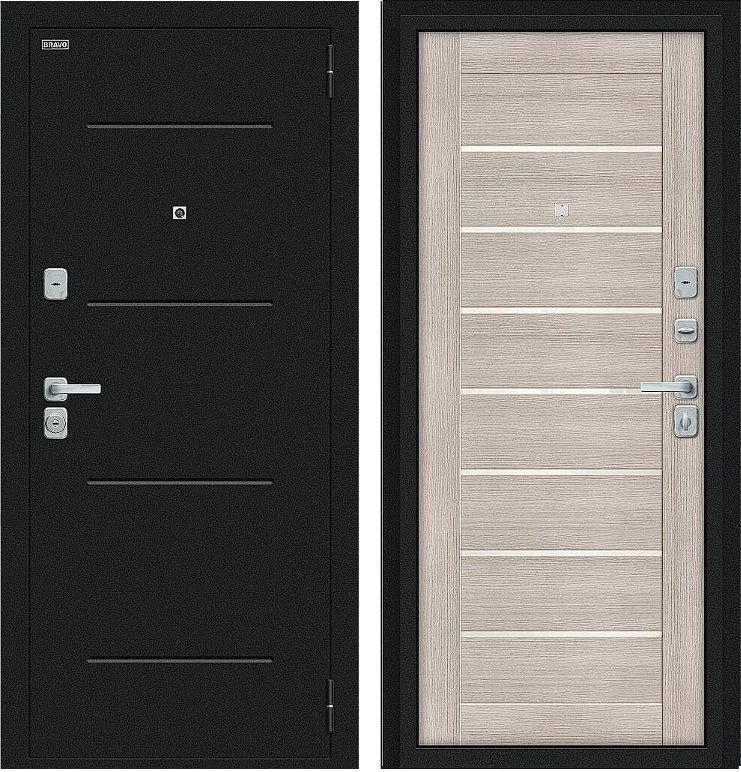 Надежная входная Дверь Браво Техно/BChrome Букле черное/Cappuccino Melinga премиум класса по цене 34 963 руб. Большая толщина стали защитит от проникновения в ваш дом, квартиру или коттедж. Используется очень качественная фурнитура: замки, цилиндры, ручки, защелки. Покрытие и отделка двери изготовлено под внимательным контролем производителя. Дверь имеет долгий срок службы и гарантию.